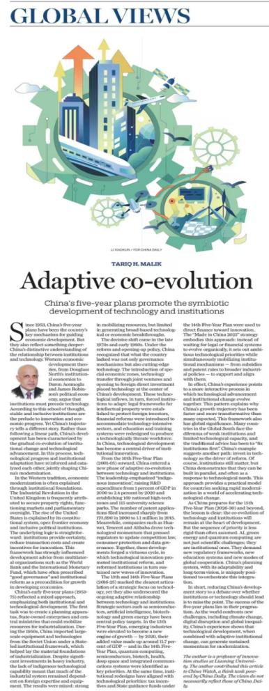 An article written by Tariq H. Malik, a professor at Liaoning University on China’s five year plan was published by China Daily a few days ago. The following is the full text of the article.