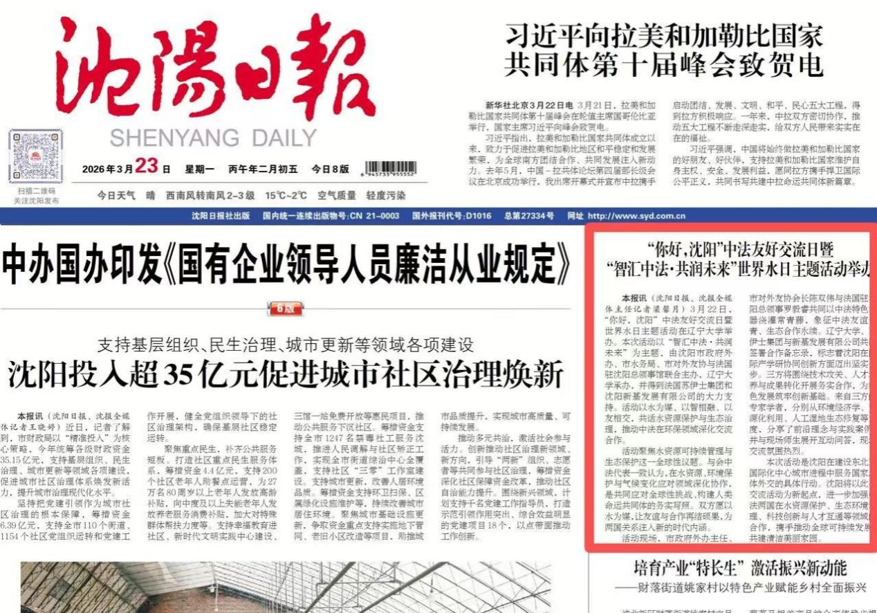 Chen Shuangwei expressed gratitude to the representatives of France’s Suez Group and people from all walks of life who have long cared about and supported Shenyang's opening-up and ecological environment construction. He stated that safeguarding water resource security and promoting aquatic ecological restoration are important global issues. China-France cooperation in the water resource sector has been continuously deepened, and this event will further advance technical mutual learning, talent exchanges and industrial cooperation in ecological governance.